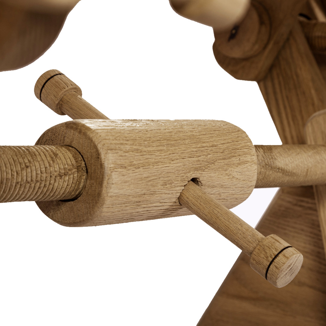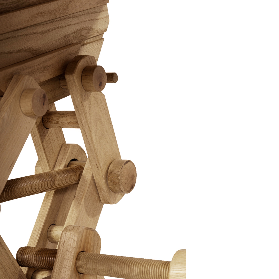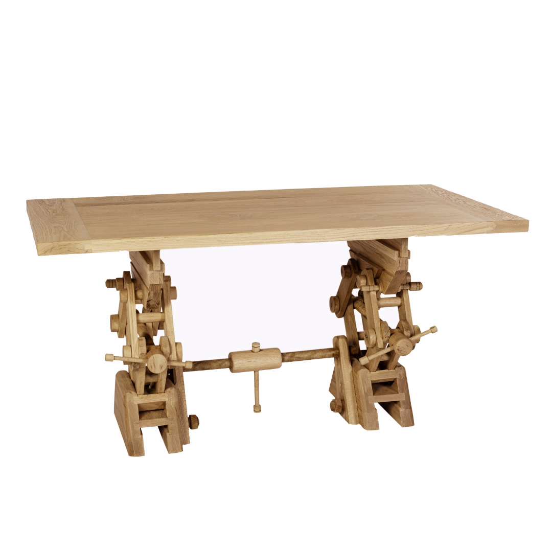 Τραπέζι χειροποίητο (στο χέρι από το μηδέν), από Ελληνικό δρυς, φουρνισμένο με καπάκι το οποίο μπορεί να χρησιμοποιηθεί και από τις δυο πλευρές του, το τραπέζι έχει την δυνατότητα αυξομείωσης ύψους από 45cm έως 80cm. Μπορεί χρησιμοποιηθεί ως γραφείο ή κεντρικό τραπέζι σαλονιού. Βασικό σε όλα τα έργα χρησιμοποιούμε χρώματα οικολογικά.